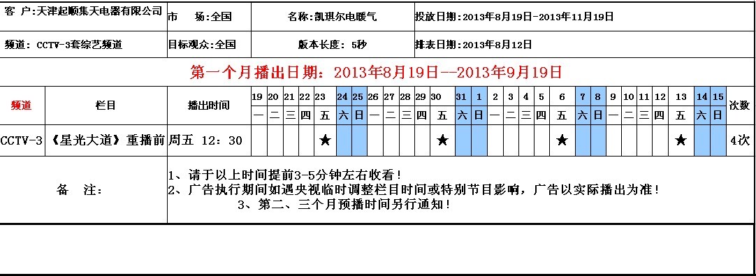 為加大市場(chǎng)推廣力度,在全國范圍內(nèi)塑造凱琪爾知名品牌形象,我公司將于本月起在CCTV-3套綜藝頻道進(jìn)行廣告推廣,以期借助中央電視臺(tái)提高凱琪爾品牌在全國的影響力。首月播出時(shí)間見通知單